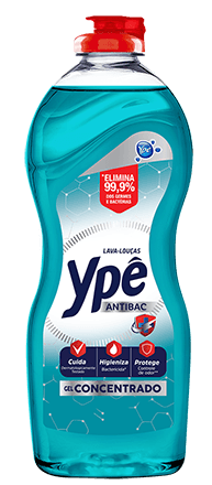 ¹Effective against: Staphylococcus aureus, Pseudomonas aeruginosa, Salmonella choleraesuis, and Escherichia coli. ²Ypê Gel Dishwasher has a high concentration of cleaning agents, therefore a small amount provides a high degreasing power compared to regular dishwasher, from the same manufacturer. ³Tests conducted in an independent laboratory on onion, garlic, egg, and fish odors.