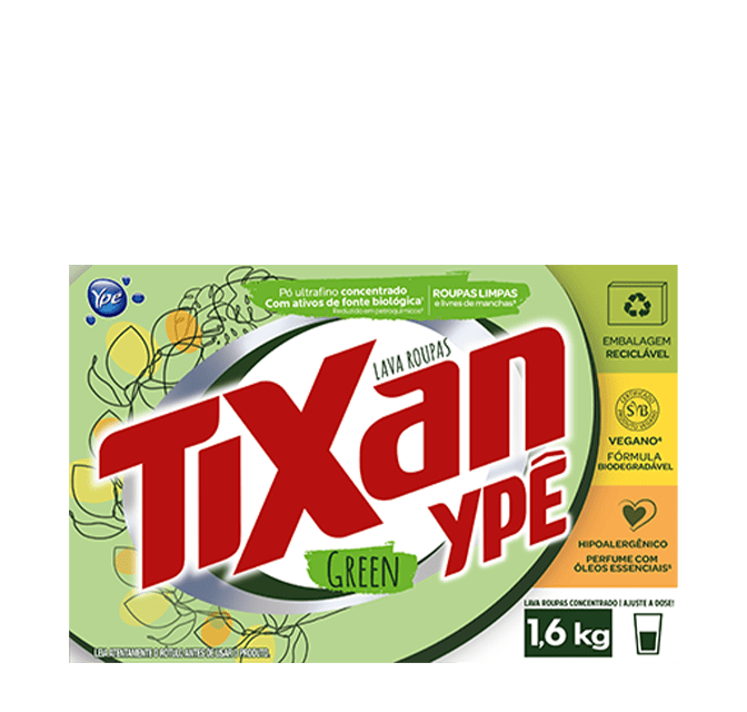 Já o Sabão em Pó Vegano Tixan Ypê Green une eficiência e sustentabilidade, com uma fórmula que prioriza a redução de sintéticos, petroquímicos e impactos ambientais.